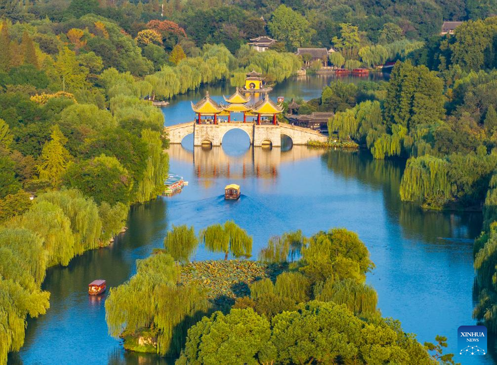 An aerial drone photo taken on Oct. 9, 2025 shows tourists taking sightseeing boats at the Slender West Lake scenic spot in Yangzhou, east China's Jiangsu Province. (Photo by Zhou Shegen/Xinhua)