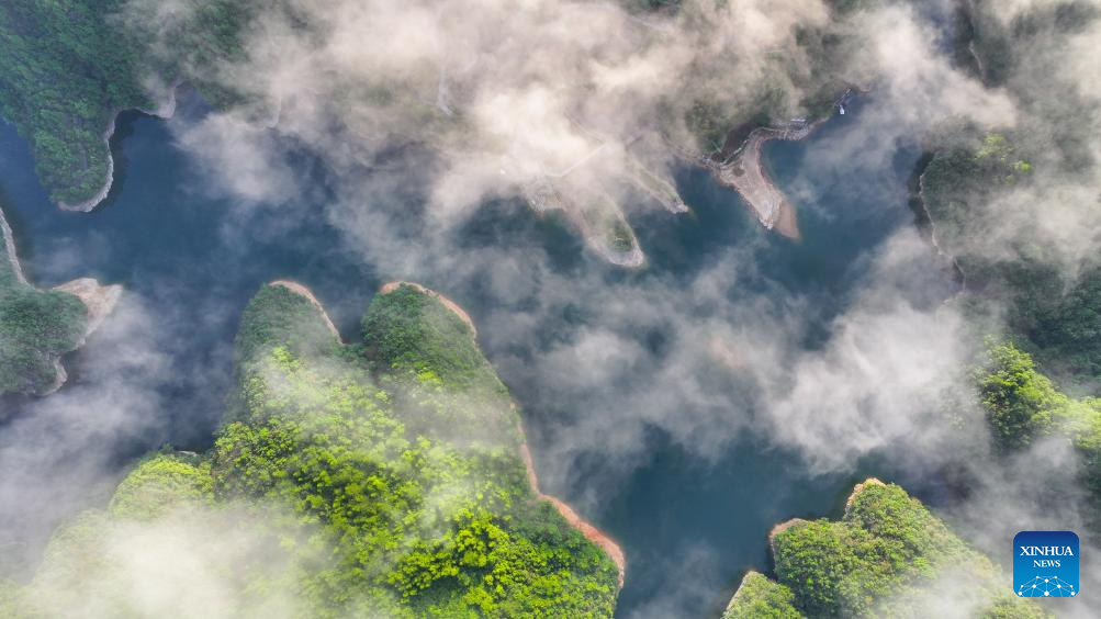 An aerial drone photo taken on Oct. 8, 2025 shows the scenery of a sea of clouds during sunrise above the Yuanyang Lake in Shiqian county, southwest China's Guizhou Province. (Photo by Li He/Xinhua)