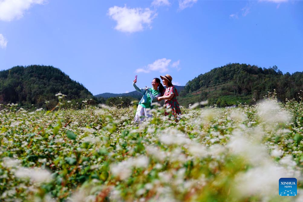 Visitors take photos at a planting base of traditional Chinese medicinal herb in Shilang Village of Qianjiang District, southwest China's Chongqing Municipality, Oct. 10, 2025. (Photo by Yang Min/Xinhua)