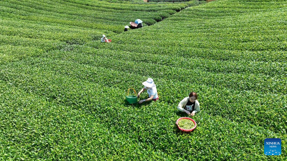 An aerial drone photo taken on Oct. 10, 2025 shows tourists experiencing picking tea leaves at a tea garden in Moganshan Town of Huzhou, east China's Zhejiang Province. (Photo by Xie Shangguo/Xinhua)