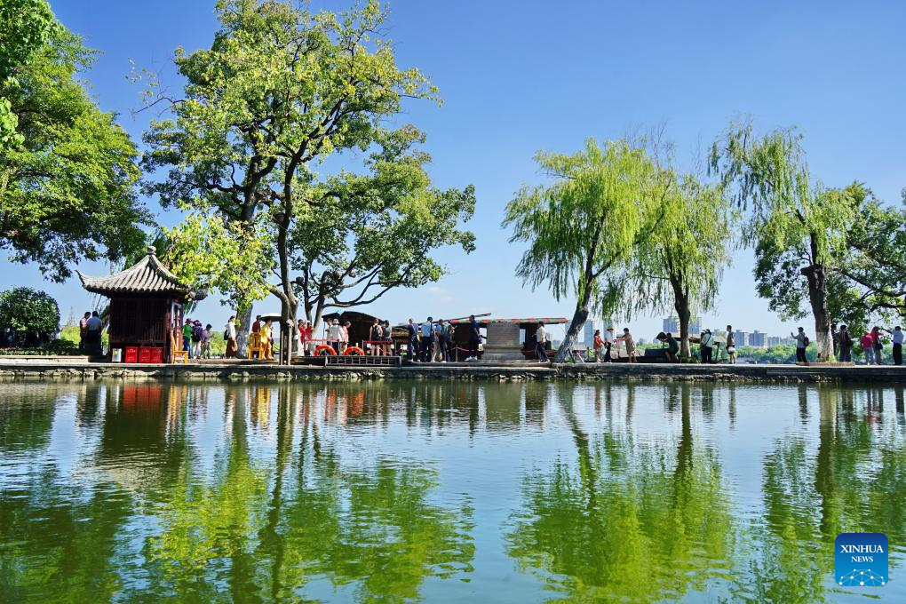 Tourists visit the Nanhu Lake scenic area in Jiaxing, east China's Zhejiang Province, Oct. 10, 2025. (Photo by Jin Peng/Xinhua)