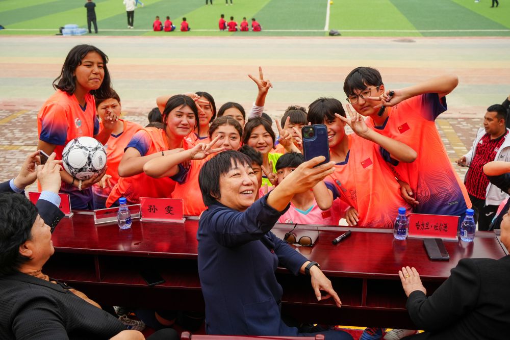 4月12日,中国足协副主席、前中国国家女子足球队球员孙雯(前中)与阿图什市U13女子足球队合影。新华社记者 徐宏岩 摄