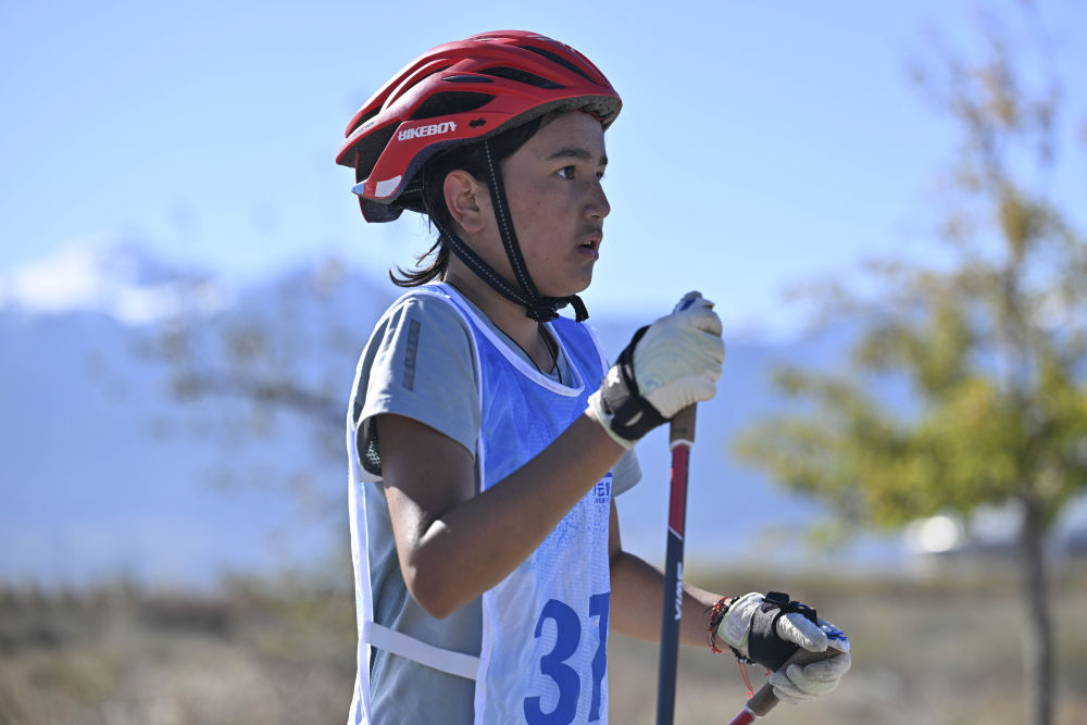 2024年10月5日,麦克丽亚·阿不都国甫在新疆维吾尔自治区第二届冬季运动会青少年越野滑轮女子甲组5公里(传统式)比赛中,她最终获得亚军。新华社记者 胡虎虎 摄