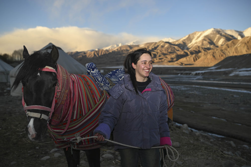 这是在新疆塔县塔什库尔干乡萨热吉勒尕村拍摄的驯马中的古丽艾萨·迪汗。新华社记者 胡虎虎 摄