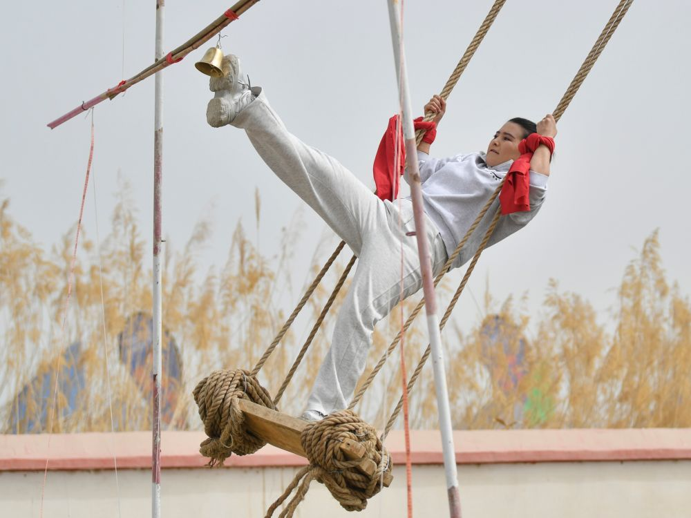 女选手在于田县先拜巴扎镇农牧民运动场参加秋千比赛。新华社记者 胡虎虎 摄