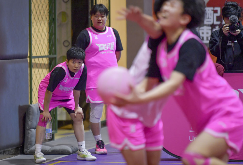 2023年4月2日,“疆来”女篮俱乐部球员在“粉色风暴”全国女子篮球城市赛乌鲁木齐站比赛中。新华社记者 王菲 摄