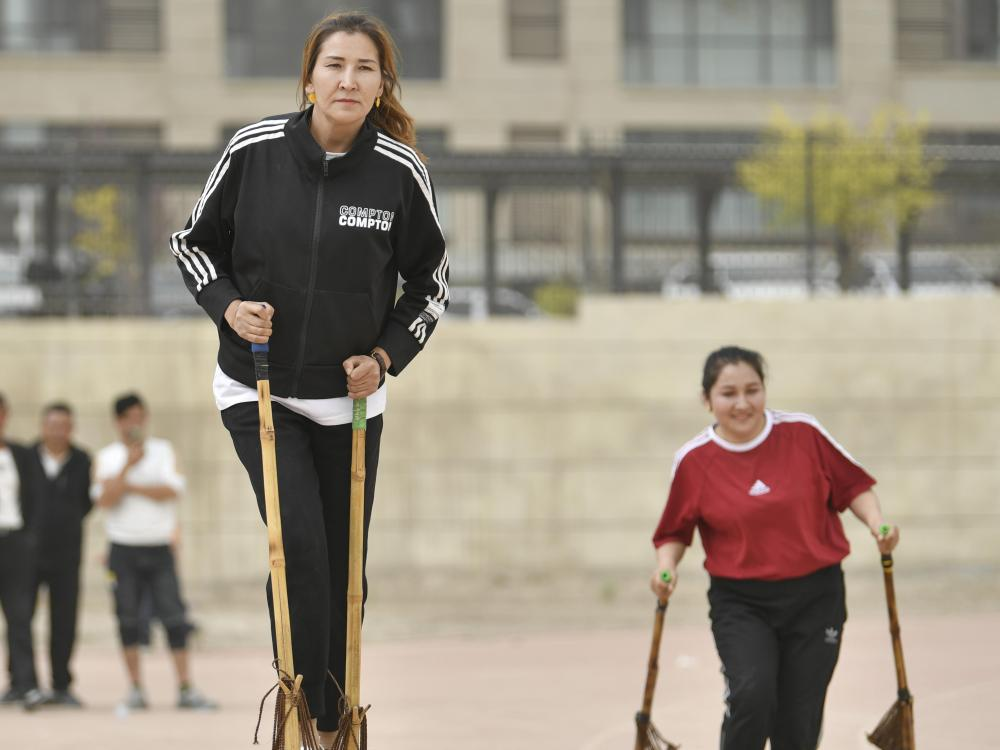 柔鲜古丽在于田县先拜巴扎农牧民运动场参加高脚竞速比赛。新华社记者 胡虎虎 摄