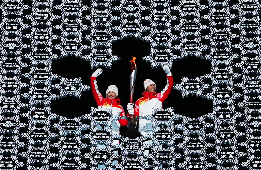 2022年2月4日晚,第二十四届冬季奥林匹克运动会开幕式在北京国家体育场举行。这是最后一棒火炬手迪妮格尔·衣拉木江(左)和赵嘉文。新华社记者 曹灿 摄