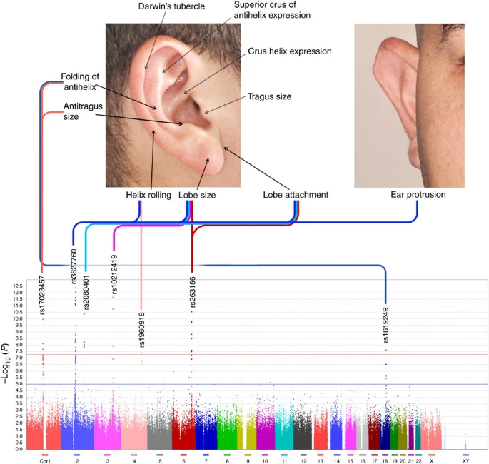 就拿五官中最不起眼的耳朵来说,老一辈称之有福相的大耳垂(Lobe size, 耳垂大小)由 3、6 和 10 号染色体上三个不同的基因位点(rs10212119,rs1990618 和 rs12538515)共同决定,年轻人中流行的精灵耳(Ear protrusion,耳廓外翻),则与 2 号染色体上的 rs3827760 位点的基因突变密切相关。