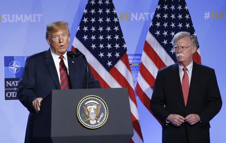 这张2018年7月12日拍摄的资料照片显示,特朗普(左)和博尔顿在比利时首都布鲁塞尔出席北约峰会。新华社记者叶平凡摄