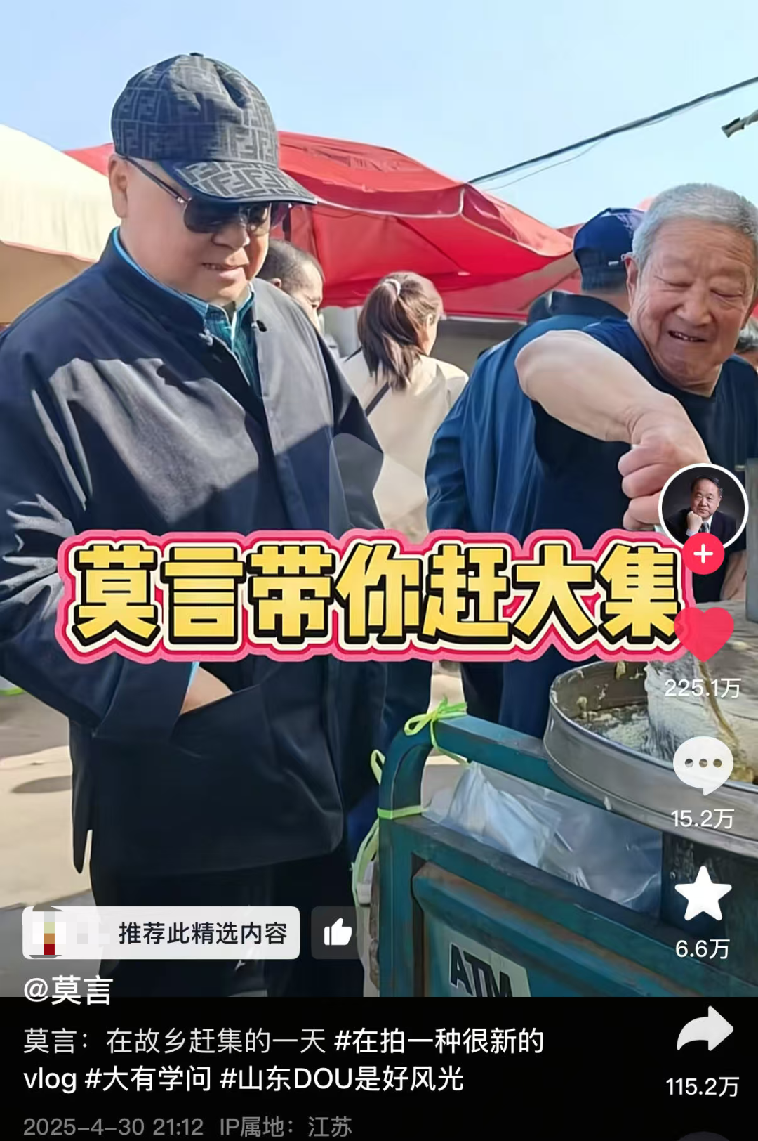 莫言也有自己的短视频账号,今年春天他发布了自己在山东赶大集的内容就在平台爆火。
