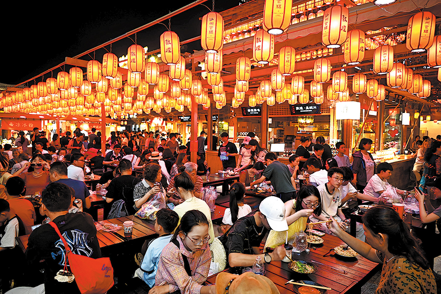 Shazhou Night Market in Dunhuang buzzes with stalls selling local snacks, crafts and souvenirs, alongside live performances.[Photo by Zhang Xiaoliang/For China Daily]