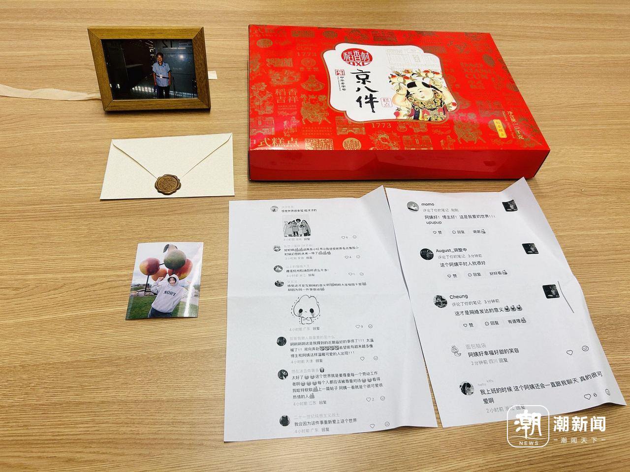 除此之外,包裹里还装着一张刘女士在新西兰旅行的照片,一封手写信、一份北京特产,以及打印出来的网友评论。