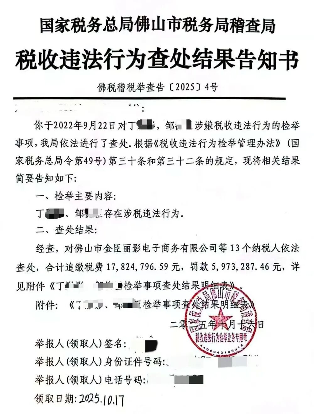 此后,记者联系佛山市税务局稽查局,对于小影夫妇补税情况,工作人员表示不便受访。佛税稽税举查告[2025]4号税收违法行为查处结果告知书显示:对丁某某、邹某某(即小影夫妇)涉嫌税收违法行为的检举事项,我局依法进行了查处。经查,两人存在涉税违法行为,对佛山市金臣丽影电子商务有限公司等13个纳税人依法查处,合计追缴税费17824796.59元,罚款5973287.46元。