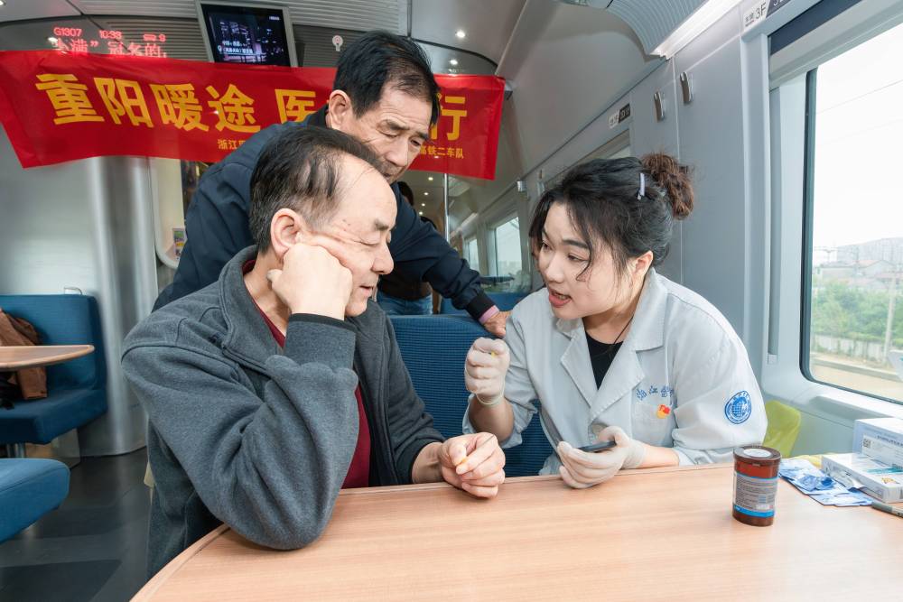 10月27日,在G1307次列车上,浙江医院严静劳模创新工作室成员(右一)为旅客提供健康咨询。