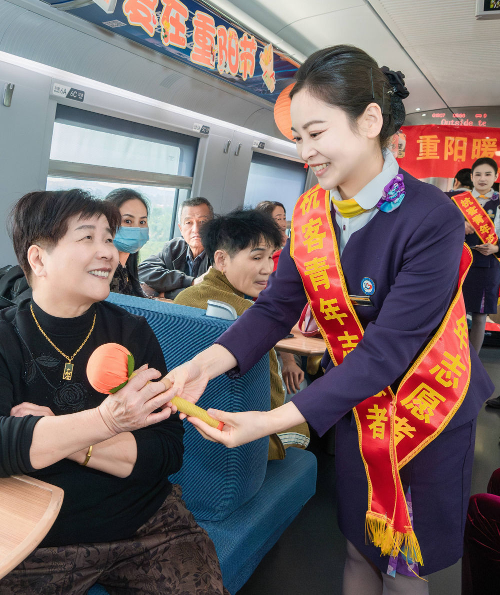 10月27日,中国铁路上海局集团有限公司杭州客运段高铁二车队巧红乘务组在重阳节来临之际,联合浙江医院严静劳模创新工作室在列车上开展“重阳暖途,医护同行”主题活动,现场还向旅客讲解海姆立克急救法,提供测量血压、血糖、健康咨询等服务。