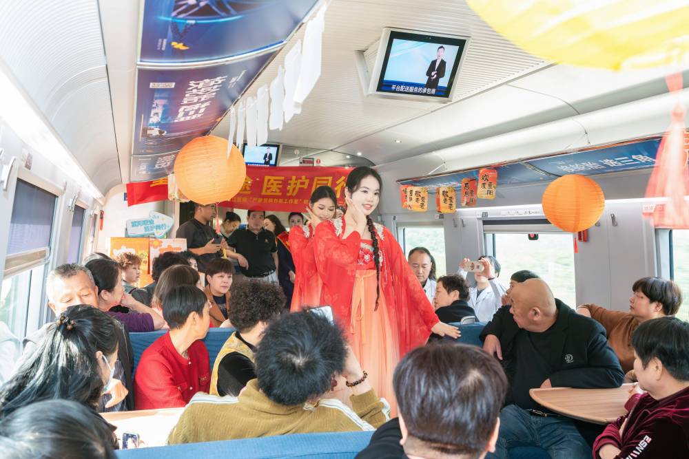 10月27日,工作人员在G1307次列车上表演舞蹈。