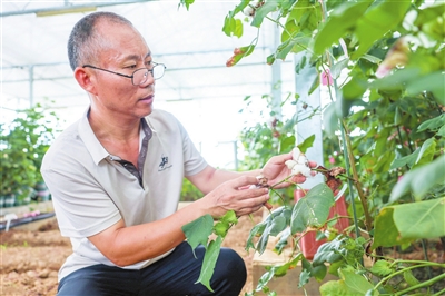 在国家野生棉种质资源圃(三亚野生棉种质圃)内,中国农业科学院棉花研究所的科研人员刘方正在大棚内仔细察看野生棉材料的生长情况。三亚日报记者刘琪成摄