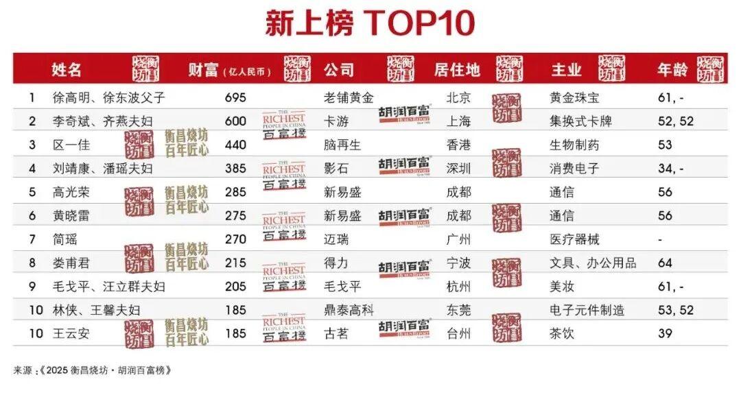 本次榜单还有376位新上榜,数量为去年的7倍。新人之首是老铺黄金的徐高明、徐东波父子,以695亿元财富跻身前100;其次是集换式卡牌龙头卡游的李奇斌、齐燕夫妇,财富600亿元。新人前十还包括智能影像设备企业影石34岁的刘靖康与其妻子潘瑶,财富385亿元。此外,“奶茶”界知名品牌古茗、霸王茶姬和沪上阿姨成功上市,创始人39岁的王云安、30岁的张俊杰和47岁的单卫钧与其妻子周蓉蓉分别以185亿元、135亿元和95亿元财富首次上榜。