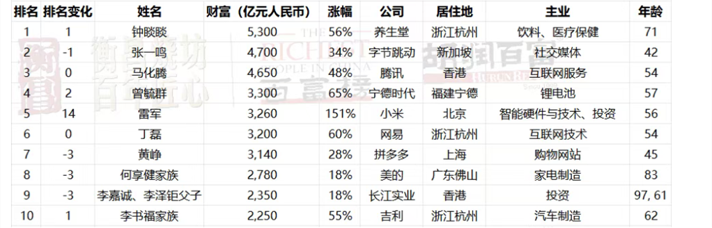 榜单显示,农夫山泉钟睒睒、字节跳动张一鸣、腾讯马化腾位居榜单前三位。翰森的钟慧娟以1410亿元取代娃哈哈的宗馥莉(875亿元)成为中国女首富。