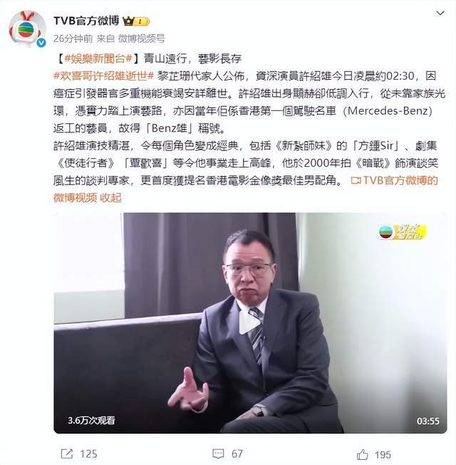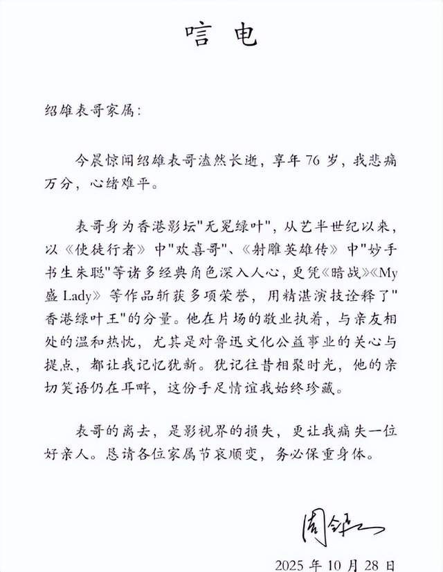 据澎湃新闻消息,10月28日凌晨,许绍雄因病逝世,享年76岁。鲁迅长孙、许绍雄表弟周令飞发来唁电:表哥用精湛演技诠释了“香港绿叶王”的分量,他的亲切笑语仍在耳畔,这份手足情谊我始终珍藏。