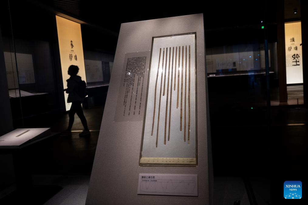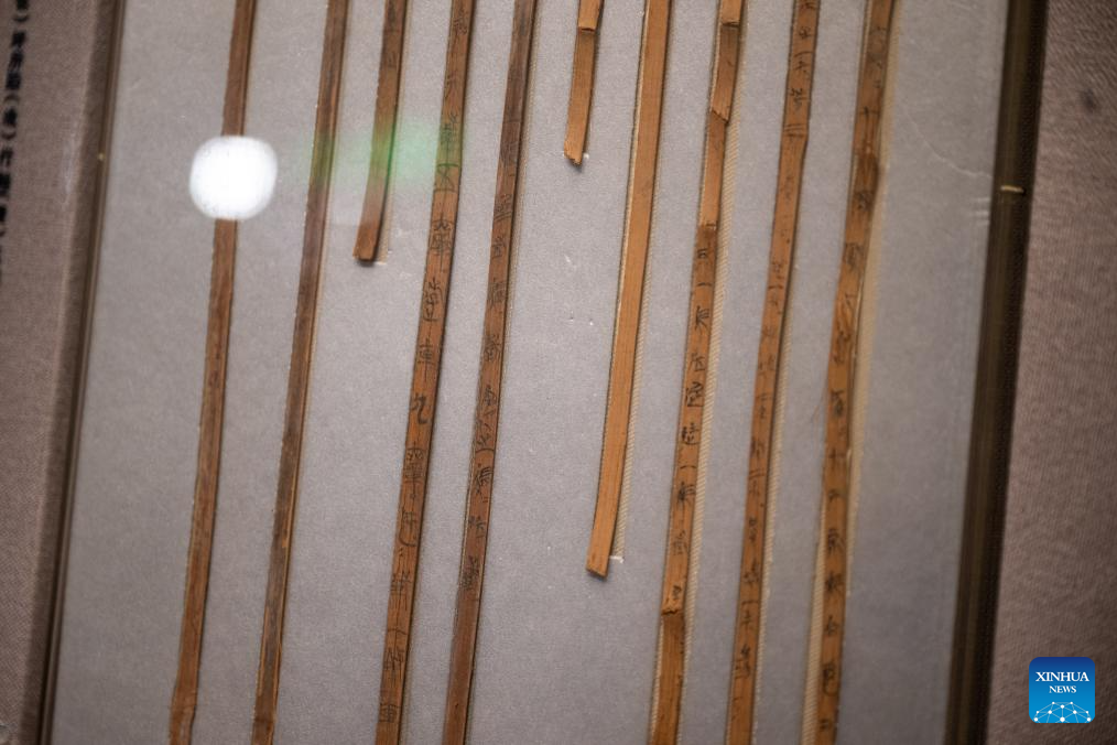This photo taken on Oct. 28, 2025 shows the exhibition "Ancient Chinese Bamboo and Wooden Slips" at the Hubei Provincial Museum in Wuhan, central China's Hubei Province.