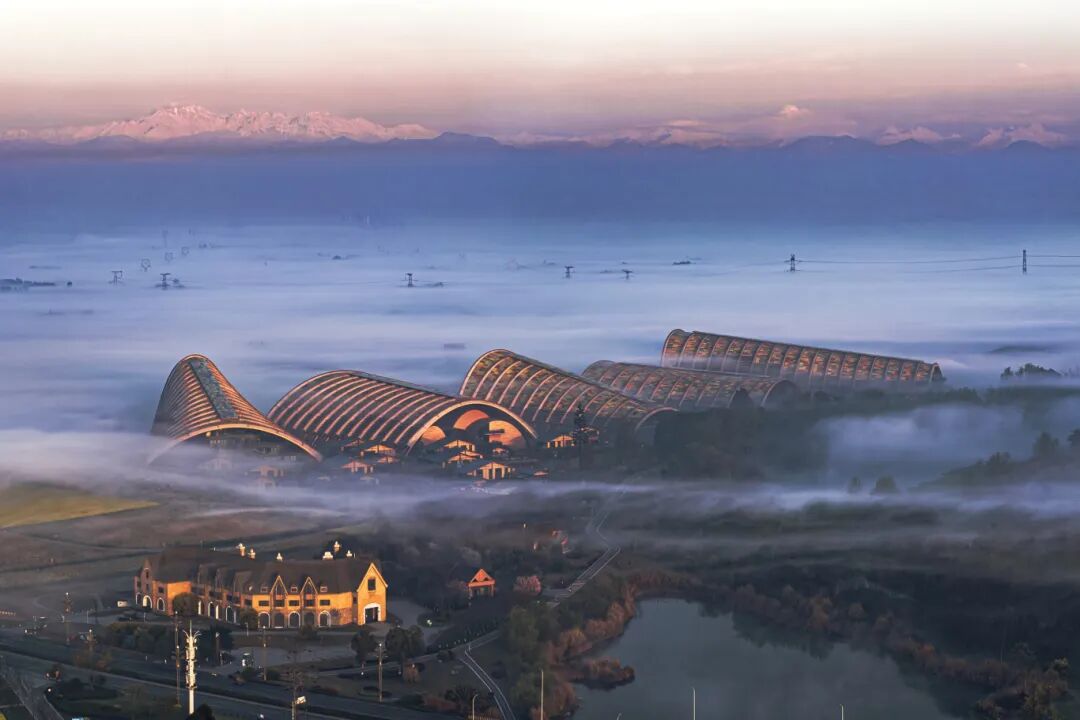 其中,就有任志刚的《氤氲天府》。画面上,乳白晨雾漫过春雨吻过的成都平原,绕上天府农博园的屋檐,欢喜地迎接清晨的第一缕金光。却不想,一下扑进西岭雪山胸膛,与天边的云彩撞了个满怀。让人一时分不清,哪是云,哪是雾。