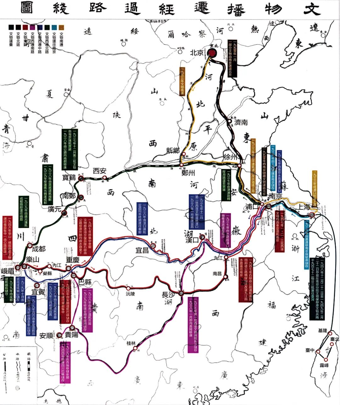 战火中,故宫文物颠沛流离。整个南迁过程,长达10余年,横跨10余省。自1933年2月起,文物先迁存于上海,后转至南京。1937年,全面抗战爆发后,分三路向西疏散:南路80箱,经长沙绕道桂林至贵阳、安顺华严洞,后转重庆巴县;中路9331箱,从武汉经宜昌转运四川乐山安谷乡;北路7287箱,经陕西宝鸡转汉中、成都、峨眉。直至1947年12月,全部东归南京。