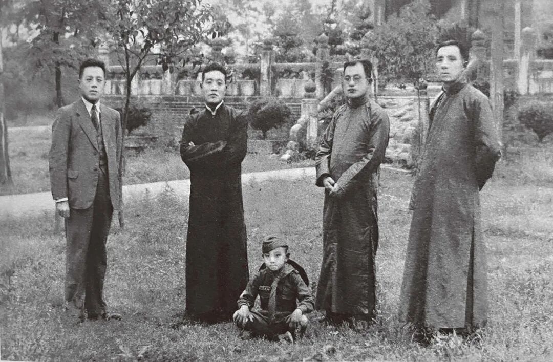 · 1938年,参与南迁的故宫人在汉中文庙前。站立者4人左起:那志良、梁廷炜、曹锦如、吴玉璋,小孩为吴玉璋儿子吴振鲲。(生活·读书·新知三联书店供图)