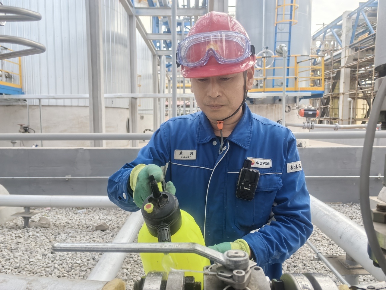 管线查漏与气密保压,是装置安全投运的关键环节。新铺管线接口繁多、连接类型复杂,自管线铺设伊始,车强便带领班组制定了“逐段排查、全程盯控”的方案。他沿着管线走向,对每个法兰连接点、阀门接口和焊缝反复检测,即便发现极细微的气泡痕迹,也要立即标记并协调整改,确保每一段管线都符合投产标准,让新装置的“血管”畅通无阻。