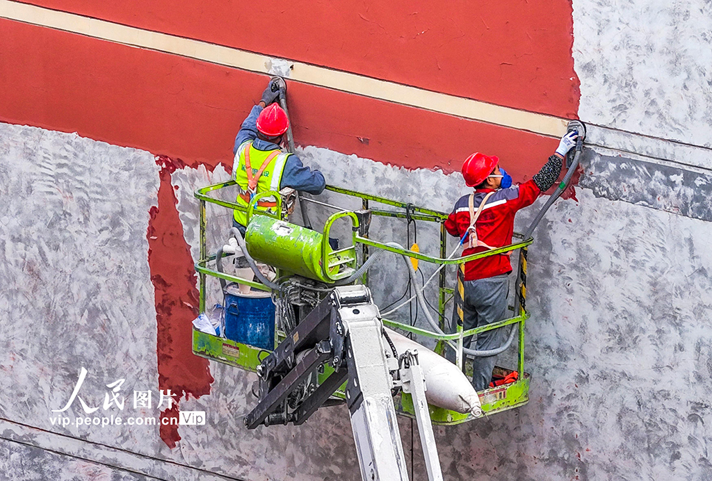 2025年11月3日,安徽省芜湖市繁昌区繁阳镇,工人正在对一老旧小区居民楼外墙面进行施工作业。