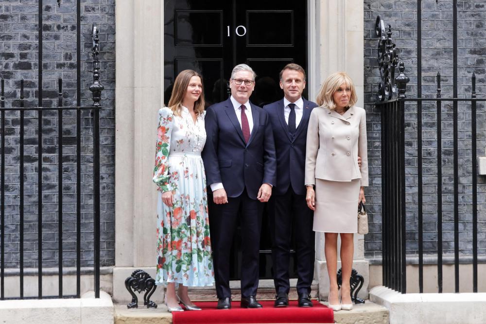 7月9日,英国首相斯塔默(左二)和夫人(左一)在英国伦敦唐宁街10号首相府前迎接法国总统马克龙(右二)和夫人。英国首相府发言人当日说,双方一致认为,打击非法移民和偷渡是两国优先事项,必须采取共同行动。新华社发
