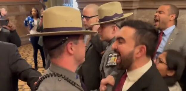 ·马姆达尼在抗议中与警方发生冲突。(视频截图)