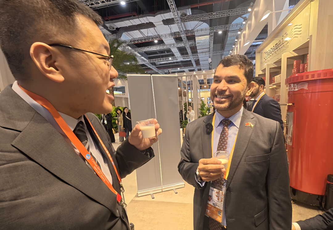 ·11月6日,纳赛尔(右)与记者一同品尝开心果牛奶。(环球人物记者 高塬/摄)
