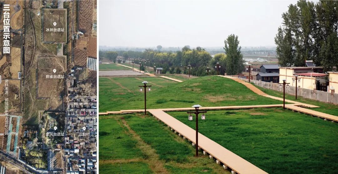 以金凤台为基准,正北方60步为铜雀台。如今铜雀台遗址的位置,与史料对三台方位和规模的记载吻合。再往北60步,就是冰井台,但遗址已丝毫不存。