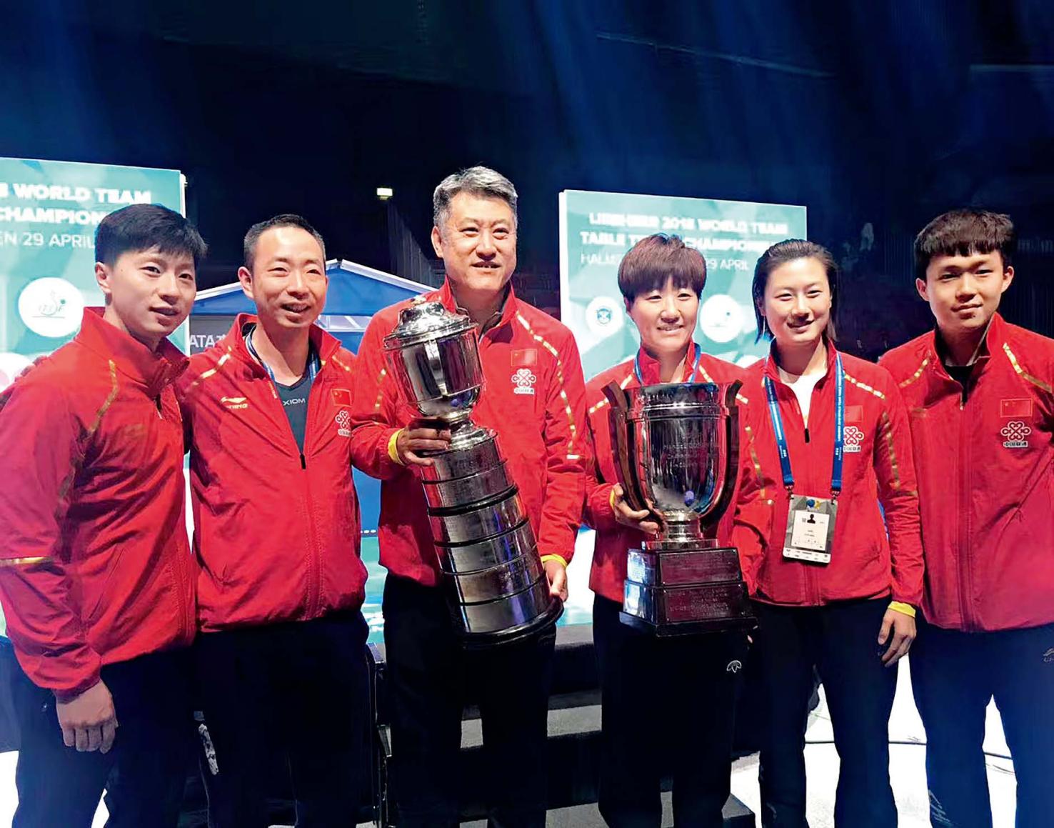 2017年瑞典世锦赛上,北京籍队员和教练合影。从左至右依次是:马龙、教练关亮、教练张雷、郭炎、丁宁、王楚钦。(北京乒乓球队供图)