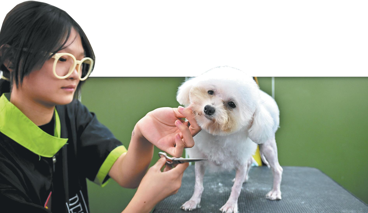 A trainee practices grooming a dog at Lele Pet Grooming School in Anshan, Liaoning province, on Oct 23. HUA YUHAN/CHINA DAILY