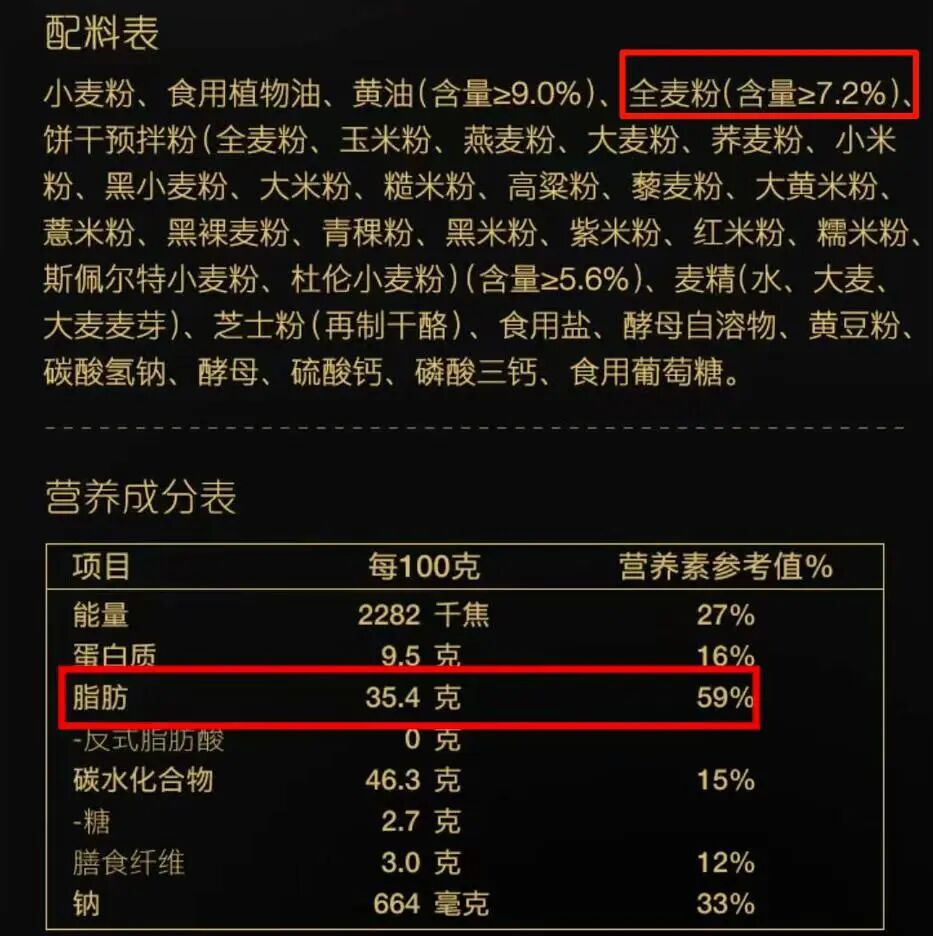 像下面这款所谓的全麦饼干,脂肪含量高达35.4%,全麦粉含量不到10%,主料其实是精制小麦粉。