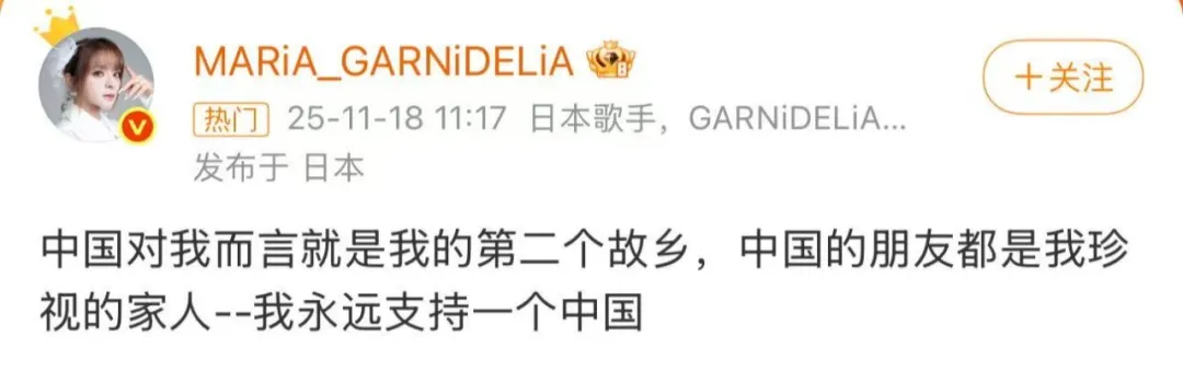 “中国对我而言就是我的第二个故乡,中国的朋友都是我珍视的家人——我永远支持一个中国。”