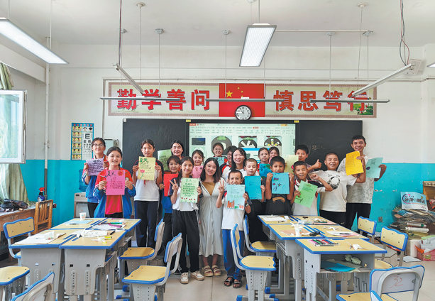 Li poses with students holding their poems at a primary school in the Xinjiang Uygur autonomous region during her teaching program this summer. CHINA DAILY