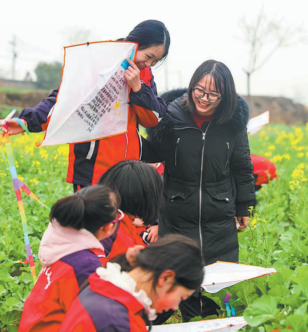 Li (right) instructs her students during a poetry lesson in a flower field. CHINA DAILY
