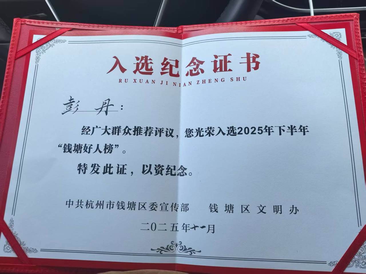 “是街道的工作人员来联系我的。”彭丹回忆道。今年9月,她的故事被潮新闻报道后,街道第一时间将她的事迹推荐报送,经过活动组委会评审、钱塘区有关部门审核等多道程序,最终成功入选了2025年的“钱塘好人”名单。钱塘区文明办的工作人员介绍:“这项荣誉是经过多项环节之后才被评选出来的。社会需要这样暖心的好故事,也需要正能量榜样。”他补充道。