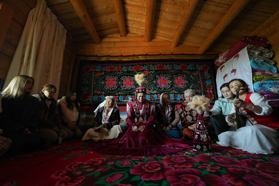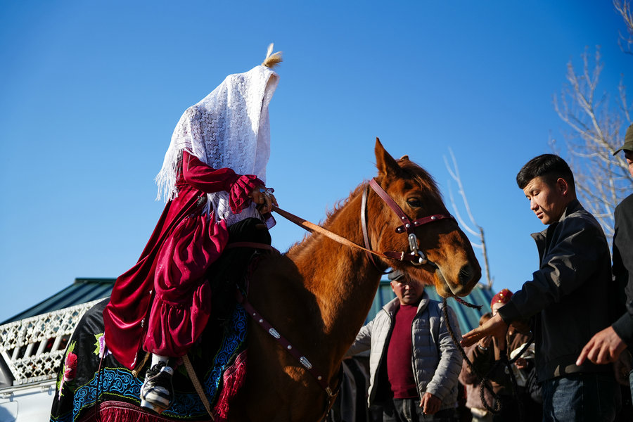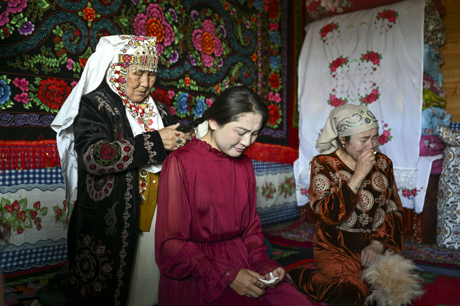 The bride's weeping is a touching tradition in Tekes county, Xinjiang Uygur autonomous region, symbolizing love, loyalty, and gratitude toward her family. [Photo by Hu Huhu/Xu Hongyang/Xinhua]