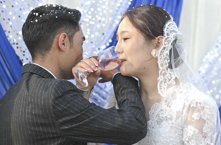 The couple interlink their arms to sip wine from each other's cups, wishing for a lifetime of happiness. [Photo by Hu Huhu/Xu Hongyang/Xinhua]