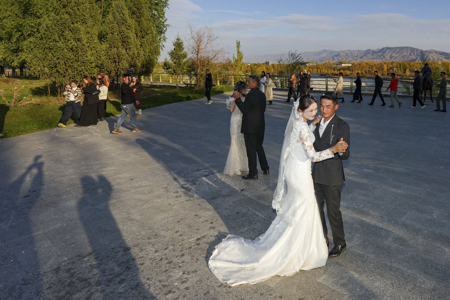 The bride and groom dance beneath the evening sky. [Photo by Hu Huhu/Xu Hongyang/Xinhua]