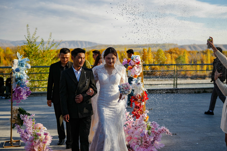 The newlyweds celebrate a modern wedding in a forest park in Tekes. [Photo by Hu Huhu/Xu Hongyang/Xinhua]