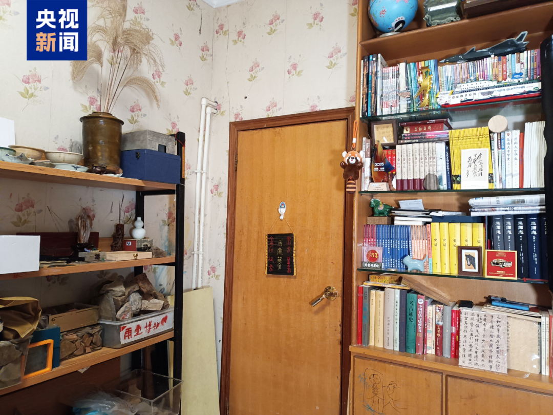 谢昭雨橦的卧室面积十几平方米,不大的空间里摆满了他的藏品,包括旧书籍、铜钱、陶器、瓷器等。谢昭雨橦给他的这个小小博物馆取名为“雨堂博物馆”,卧室门外还贴有他亲笔写下的“雨堂博物馆”门牌。
