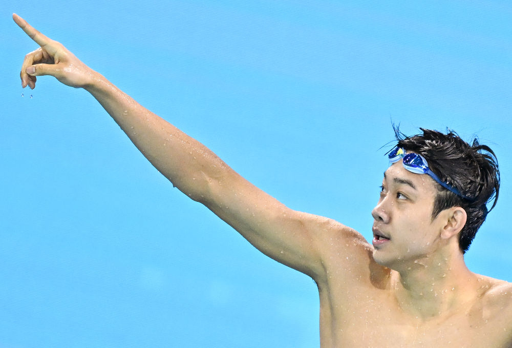 2024年7月31日,潘展乐在巴黎奥运会男子100米自由泳决赛后庆祝。新华社记者 杜宇 摄
