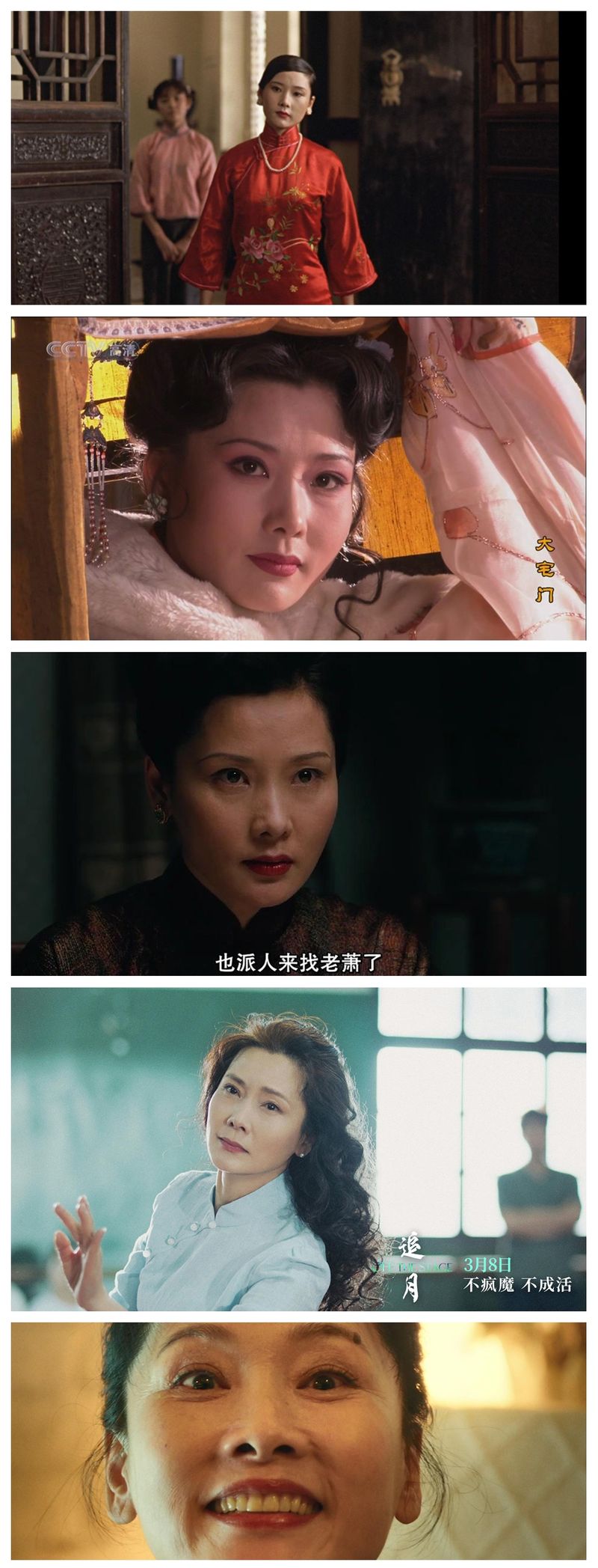 从上至下分别为何赛飞出演《大红灯笼高高挂》《大宅门》《色,戒》《追月》《你行!你上!》剧照。