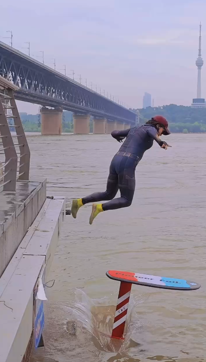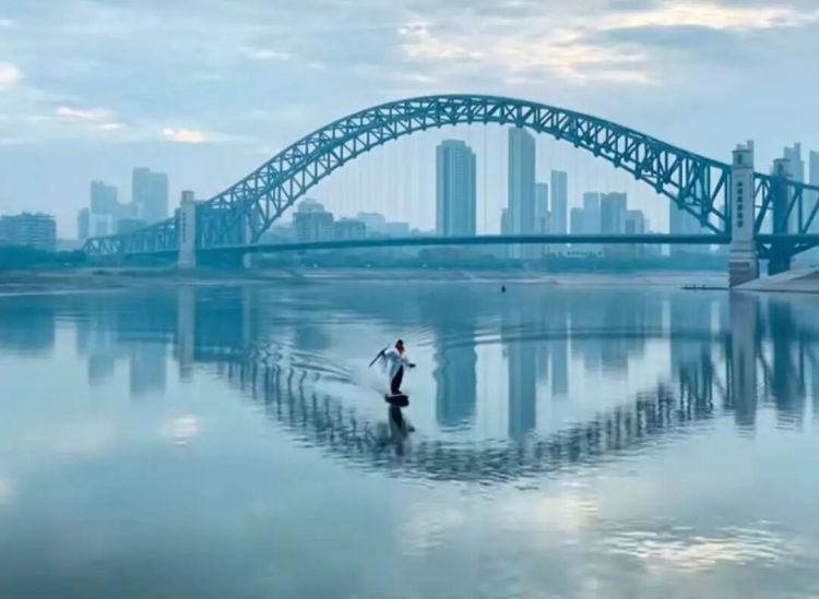“视频是上周日清晨拍的,脚下的‘剑’是一块电动水翼板。”胡帆走路快速有力,说话干脆利落。她告诉记者,两年多前,她接触到无动力水翼运动,并成为武汉第一个掌握无动力水翼技术的女性,之后业余时间一直致力于这项运动的推广。今年,她开始尝试推广更容易操作的电动水翼板。